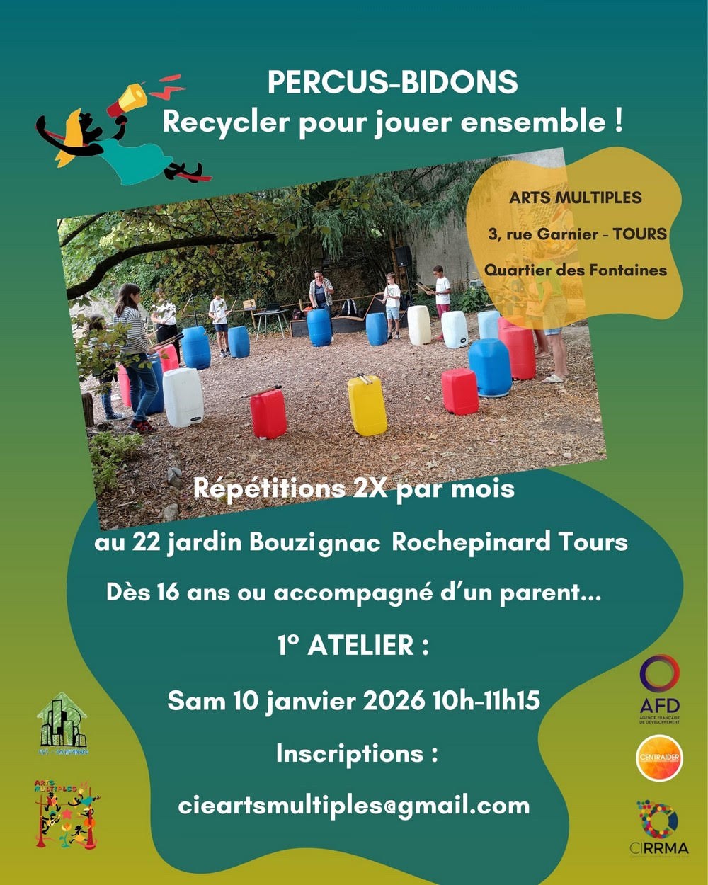 Pour 2026-2027, Arts Multiples a souhaité offrir aux habitants (jeunes et adultes) de Tours et des quartiers sud, des ateliers réguliers et gratuits pour progresser et former ensemble un vrai orchestre de percussions.